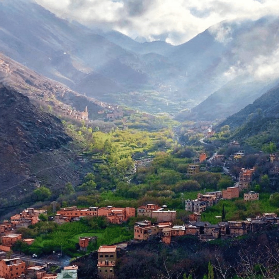 Leave Marrakech for the High Atlas and the Imlil Valley (≈1,700 m). Drive across the Haouz plains and Asni (the “apple town”), then enjoy a gentle hike through charming Berber villages, apple and cherry orchards, and shady walnut groves with sweeping Atlas views. Share Moroccan mint tea and a home‑cooked lunch with a local family before returning to Marrakech.